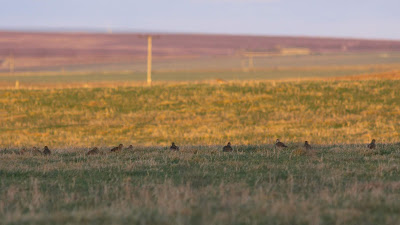 Back home, and once more staring out of the window, I spotted a pipit sat on the top wire of the fence of the field over the road. As the light was still peachy, I grabbed my bins to inspect the bird's side-lit features. Typically, at this point, it flew to the ground out of sight, so I waited patiently for it to resume its perch. When it flew back up, it wasn't alone, so when my lenses settled upon what I thought was the pipit, I had a bit of a shock.